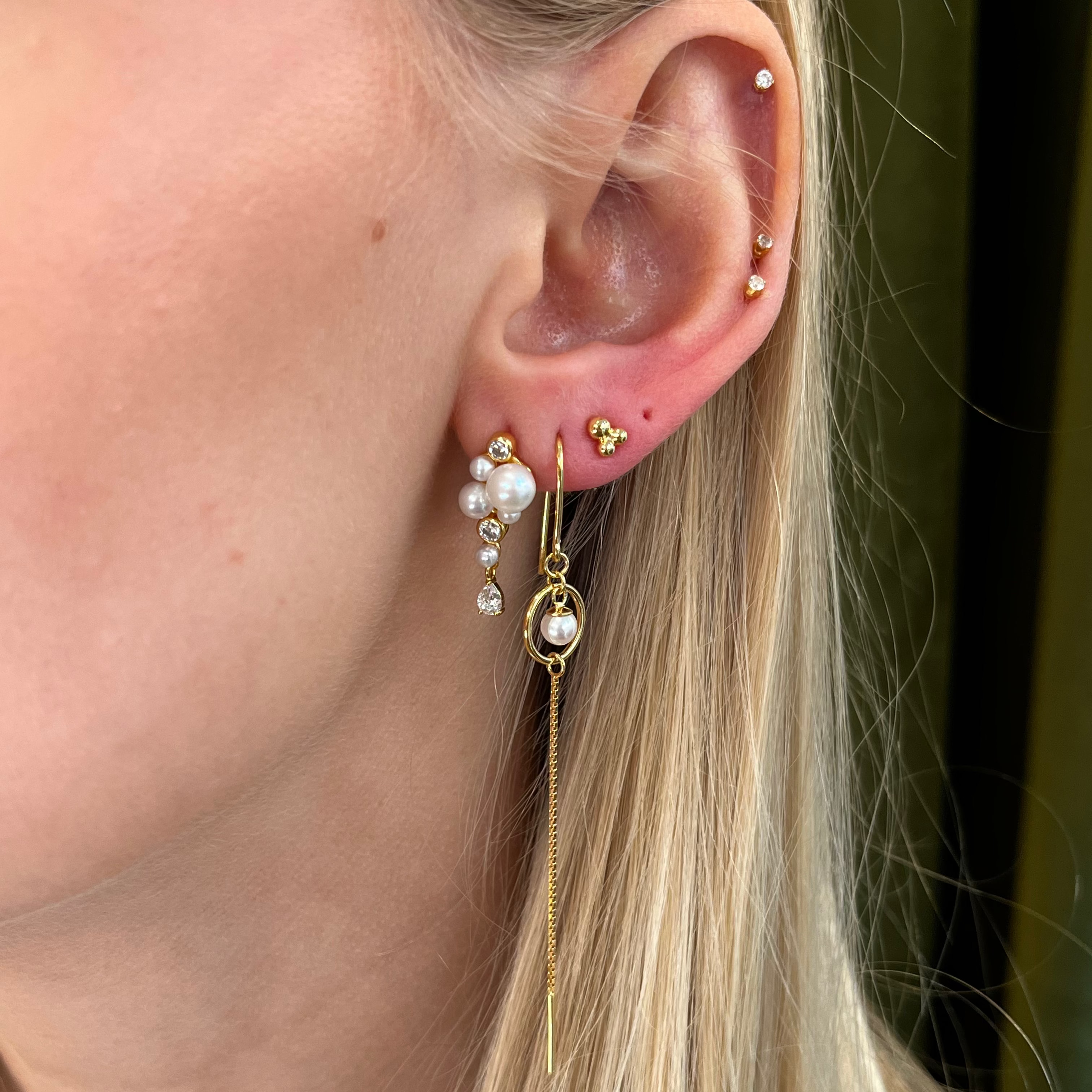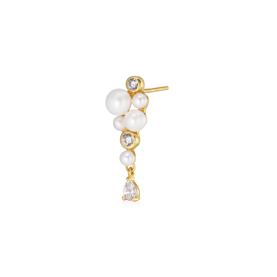 The design creates a beautiful play between structure and movement. At the top, pearls and zirconia form a decorative cluster, while a teardrop-shaped zirconia hangs lightly below, adding extra shine and movement. The warm gold-plated surface emphasizes the natural glow of the pearls and gives the jewelery an exclusive and refined look.
