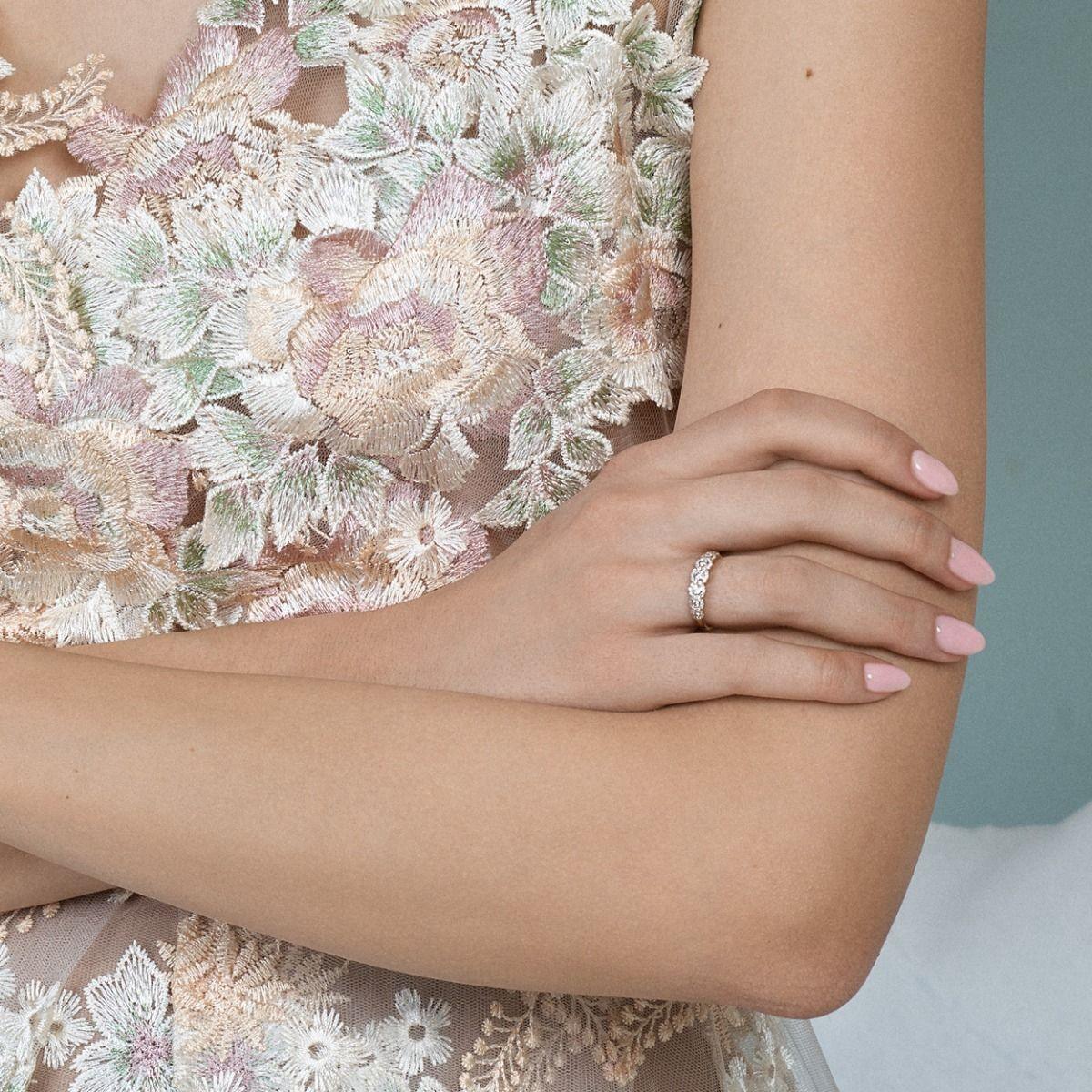The Nuran Duchess ring is a majestic choice that exudes elegance and luxury. This ring is crafted in 14 carat gold and set with a total of 0.57 carats of W-si brilliants. The central part of the ring is adorned with seven larger diamonds surrounded by a circle of small diamonds, creating a brilliant effect and adding depth to the design. The detailed design makes this ring a perfect choice as an engagement ring, and it is sure to impress your loved one on special occasions.