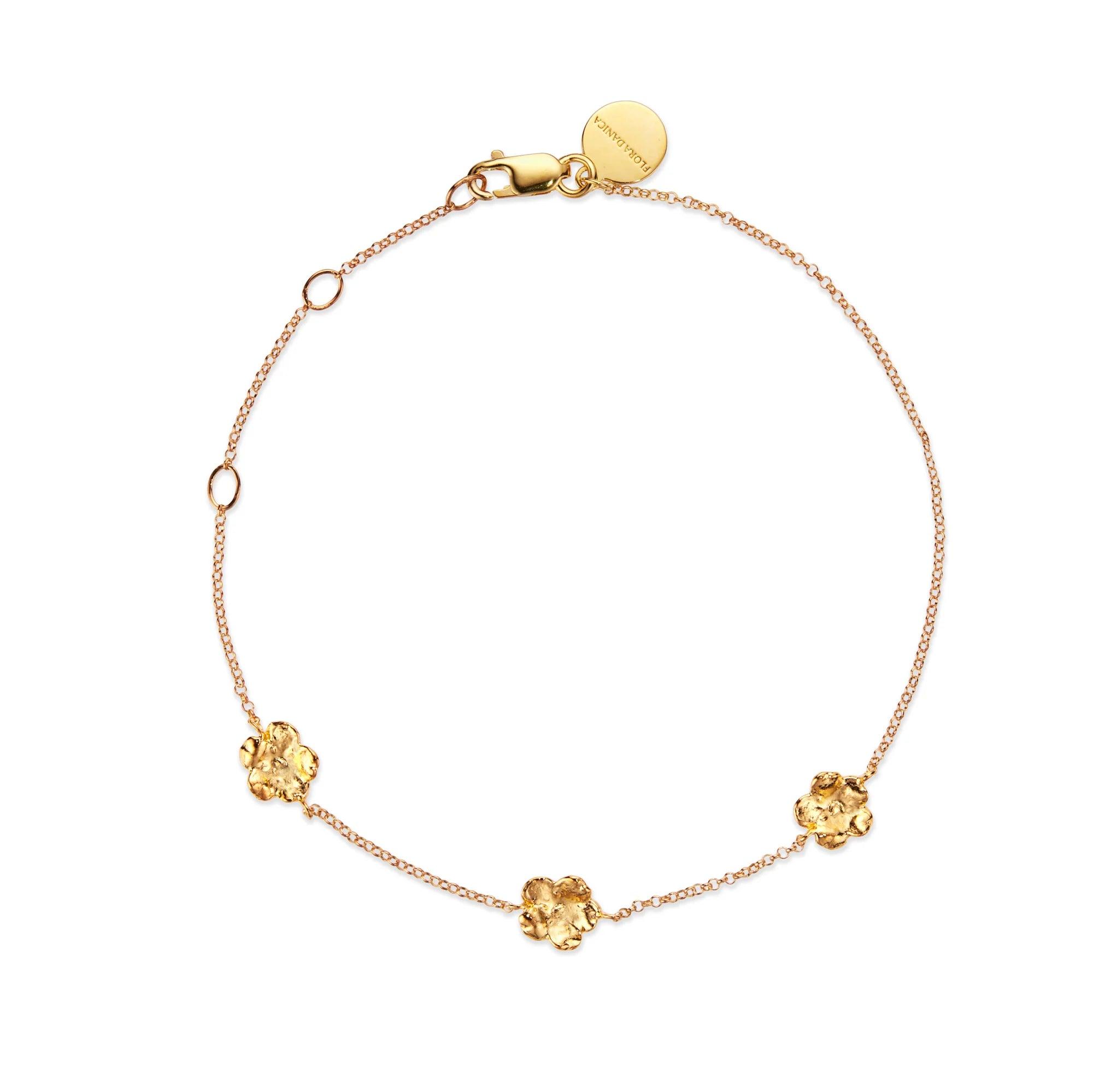 The Forget-me-not collection has been one of our most loved since its introduction in 1952. Symbolizing fidelity, love and friendship, this bracelet is a timeless expression of the depth of emotion. It carries three delicate forget-me-not flowers, coated with a touch of golden luster, on an elegant adjustable chain (16, 18, 19.5 cm). Crafted in 925 sterling silver with a lustrous 22 carat gold plating, this bracelet is not only beautiful but also durable. Each flower has a subtle width of 6mm, adding a fine detail to this piece of jewellery.