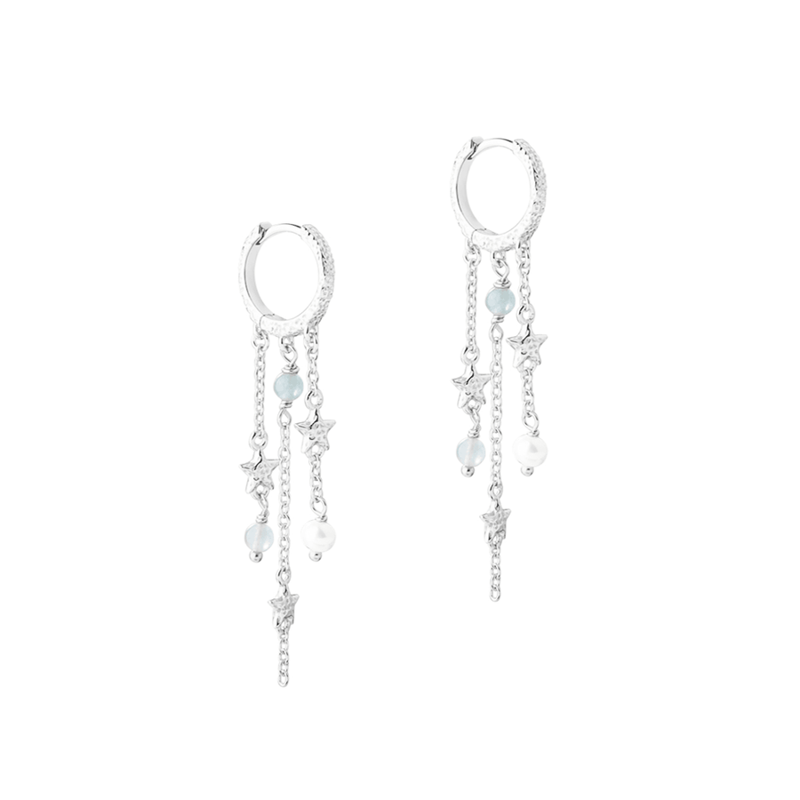 The Aqua Dulce Stella Hoop earrings in silver are an elegant earring that combines the natural beauty of starfish, freshwater pearls and aquamarines. This earring adds a refined and timeless touch to your style, perfect for both everyday and special occasions.