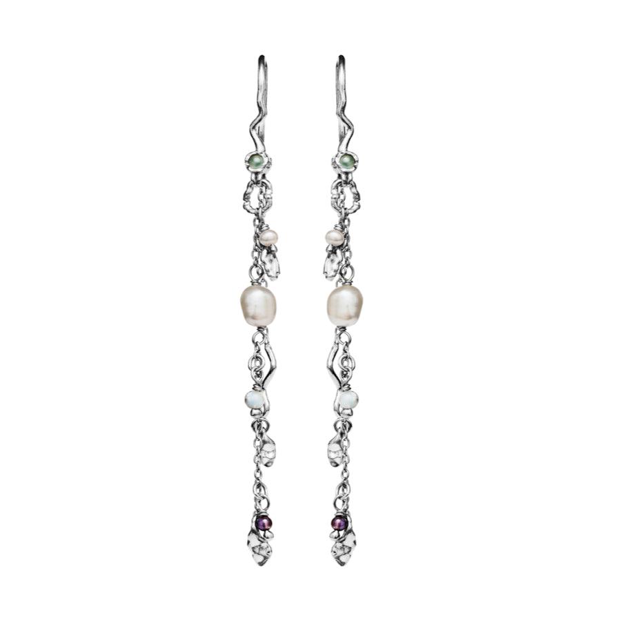 The Poppy earrings from Maanesten are a unique and feminine jewelery choice. They have a unique style where the focus is on organic shapes, stones and pearls. The chain is decorated with freshwater pearls, synthetic aquamarine and synthetic amethyst, which together with the fine twisted gold details create a breathtaking look.