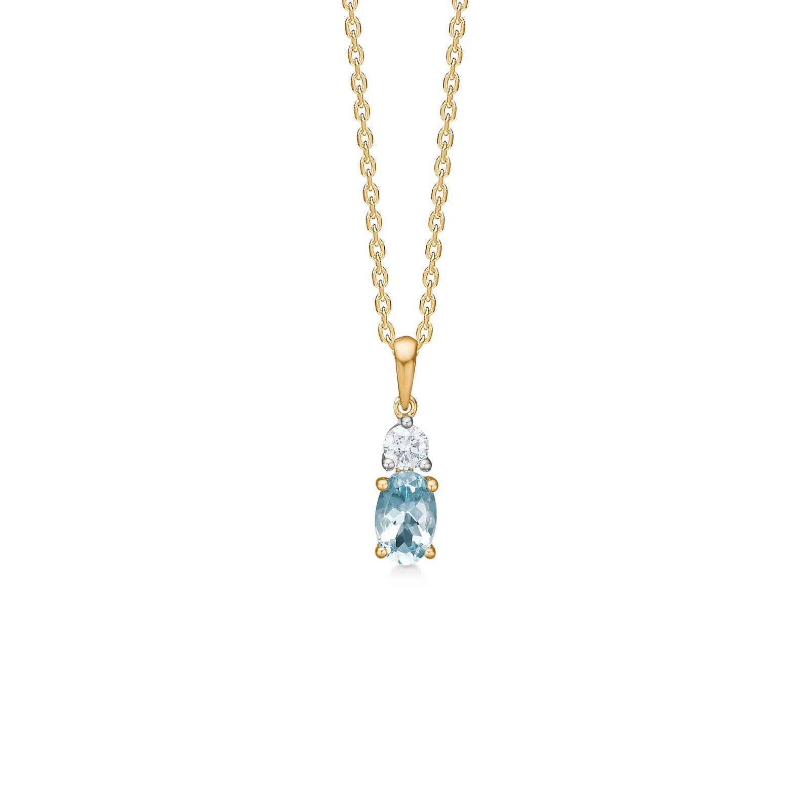 The pendant is created in 14 carat gold and adorned with a brilliant blue topaz and a brilliant cut diamond that catches the light like a clear summer sky. Adds a sparkling play and luxurious depth to your outfit.