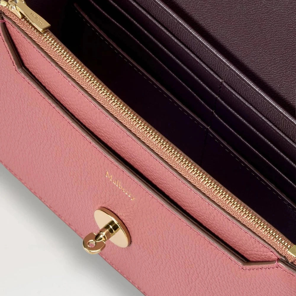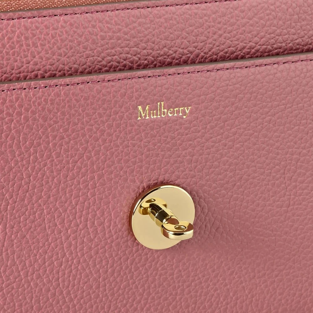 Small Darley in the color Pink Scrumpy from Mulberry, has the iconic postman's lock in gold hardware. The simple and classic look means that you can use it for both everyday life and parties. It has a place for eight credit cards and a practical zipped pocket.