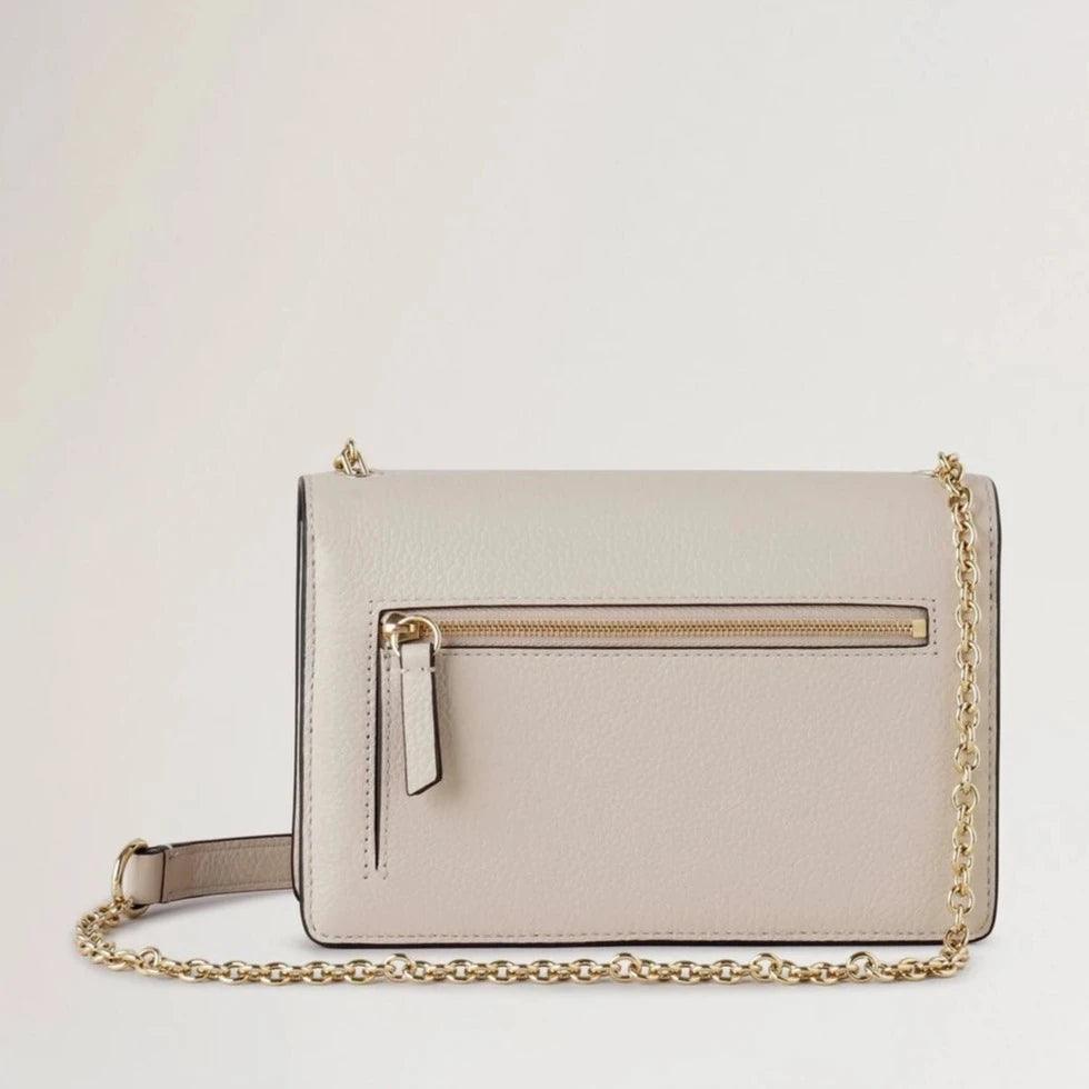 Small Darley in the color Chalk from Mulberry, has the iconic postman's lock in Soft Gold hardware. The simple and classic look means that you can use it for both everyday life and parties. It has a place for eight credit cards and a practical zipped pocket.
