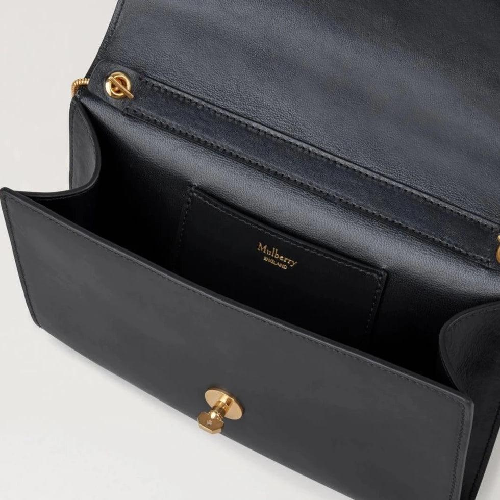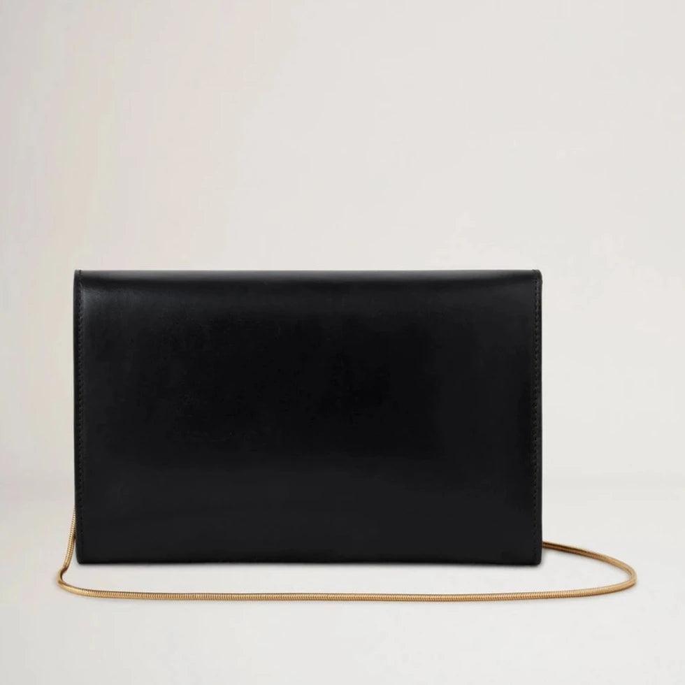 Mulberry The Lana Clutch is the perfect evening bag with a stylish design and modern details. Crafted in black patent leather with a high-gloss finish, the bag is adorned with the new Foundry Lock closure, a modern interpretation of the iconic Postman's Lock. With a detachable chain strap and a single main compartment with nappa lining, this clutch combines elegance and functionality.