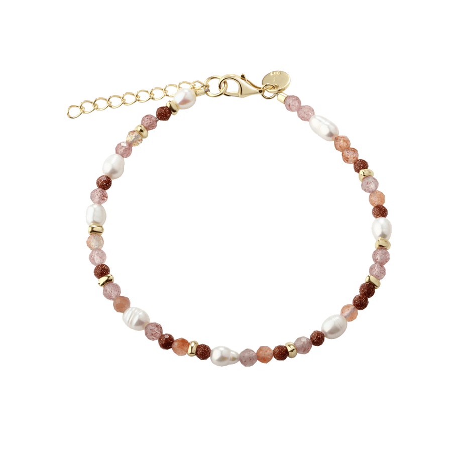 The Aqua Dulce Peachy bracelet in gold-plated silver is a delicate and feminine bracelet that combines a beautiful mix of green strawberry quartz, freshwater pearls, golden sand and sunstone. This bracelet adds a sophisticated and brilliant touch to any style.