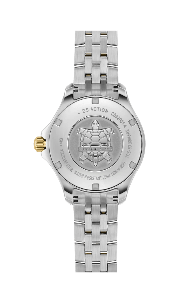 The Certina DS Action Lady Diamonds is an elegant and timeless ladies' watch that combines Swiss precision with a luxurious design. With a mother-of-pearl dial adorned with diamonds and a durable PVD-coated stainless steel case, this watch is both beautiful and durable. The watch is waterproof up to 20 bar, which makes it suitable for both everyday use and special occasions.