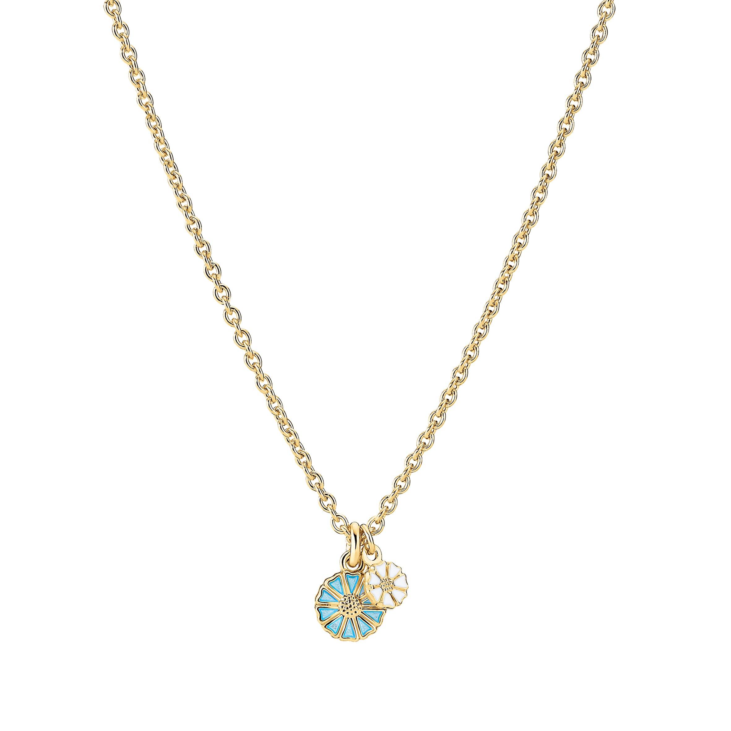 Lund Copenhagen Marguerite necklace / chain with pendant is a beautiful and timeless piece of jewelry that combines classic design with modern elegance. Crafted in 925 sterling silver with 24k gold plating, this necklace is adorned with two enamel daisies – a 5mm white daisy and a 7.5mm pale blue daisy. The necklace has an adjustable chain that can be adjusted in length from 45 cm to 48 cm, which makes it ideal for both everyday and festive occasions. The unique combination of gold-plated silver and colorful enamel adds a touch of luxury and Scandinavian design to any jewelry collection.