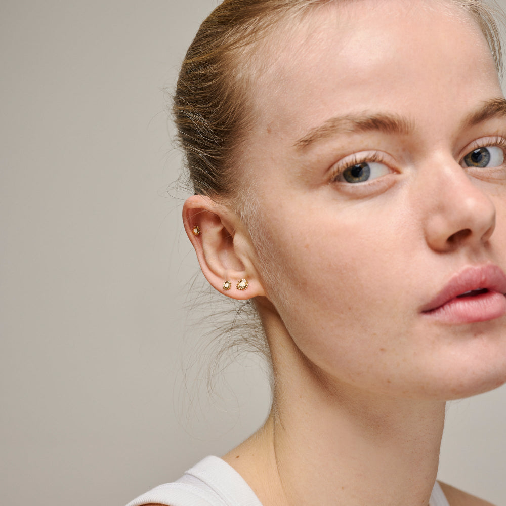 Small fine earrings with a calm and natural beige centre. Perfect for those who love a subdued and harmonious look. The design resembles a sun or sunflower and adds a beautiful detail to your jewelry mix. Available in several colors.