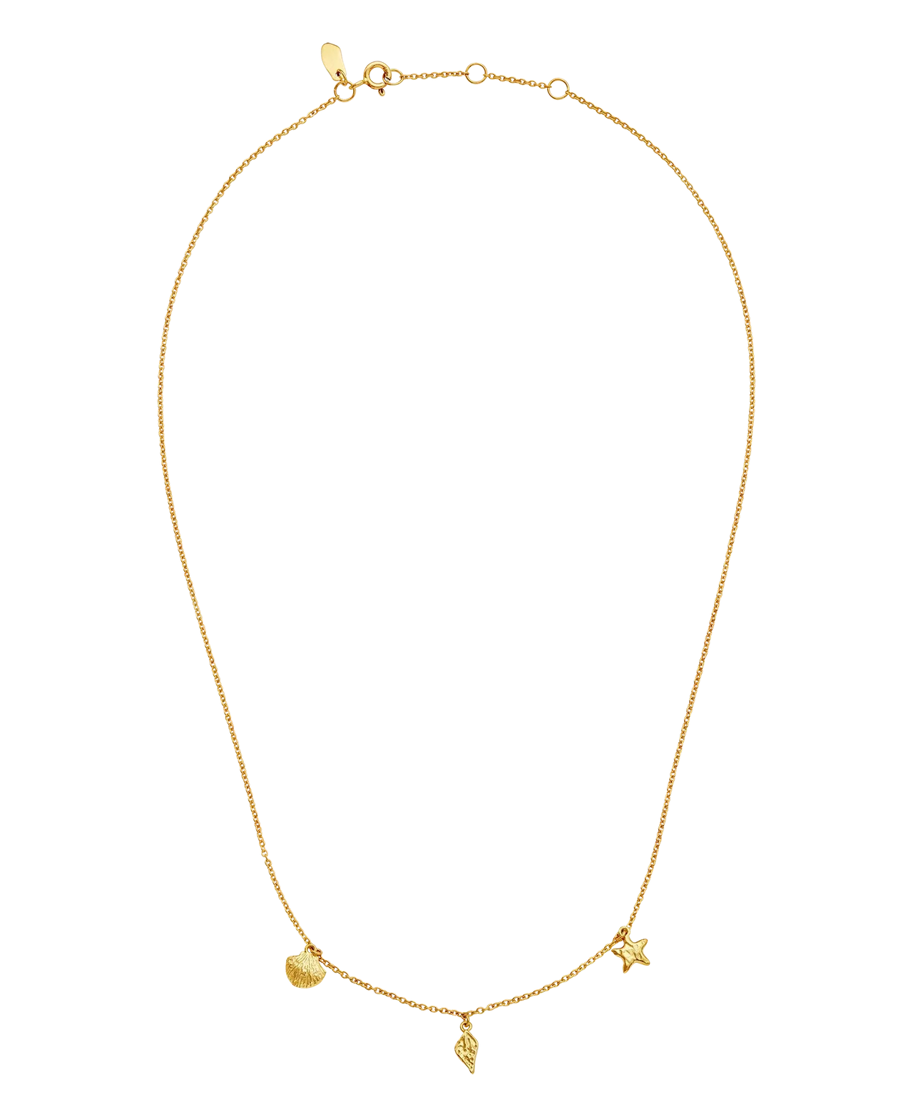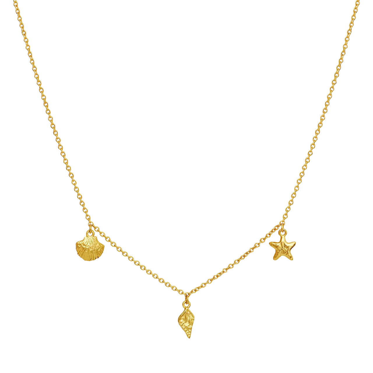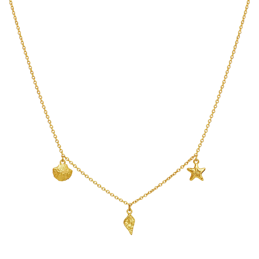 The Moon Stone Iluka Necklace feels like a small collection of treasures found along the edge of the sea. The fine pendants – mussel, starfish and a small conch – give the necklace a playful and summery expression that exudes sun, salt water and carefree days.