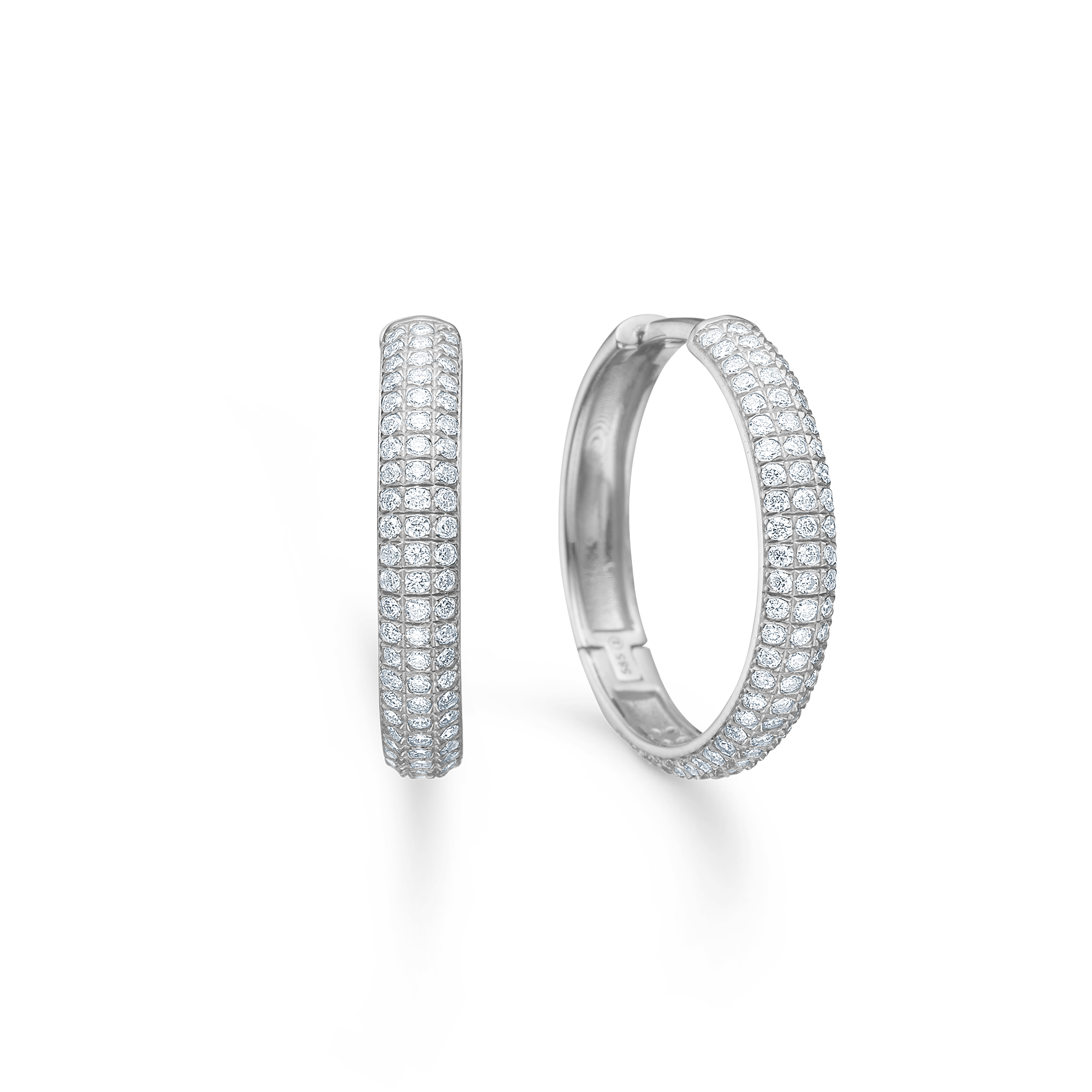 Lunette earrings in rhodium-plated sterling silver with pavé-set white topazes combine Nordic elegance, modern design and uncompromising craftsmanship.