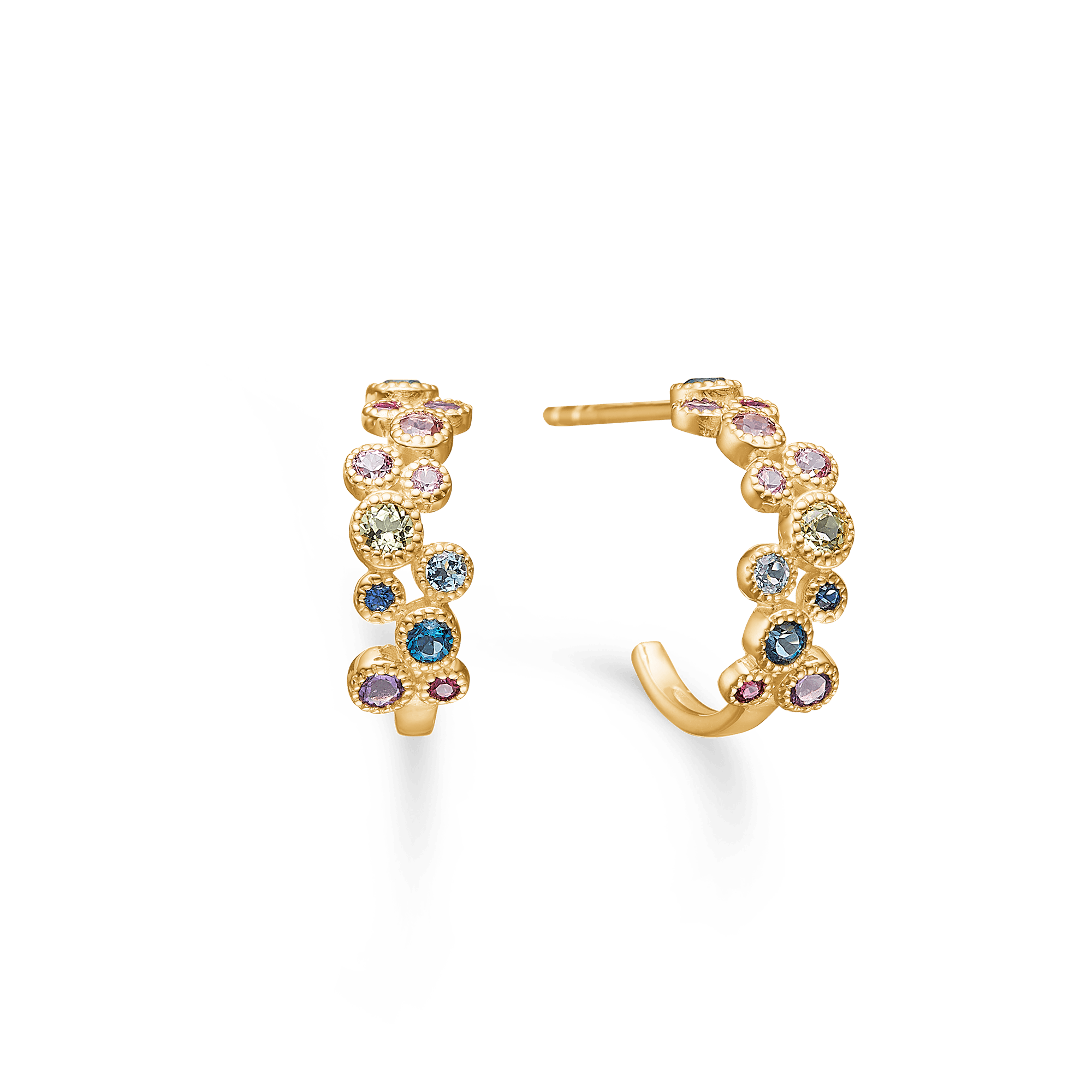 The Luxury Rainbow Petite earrings from Mads Z are a sophisticated and beautiful variant of the popular Luxury Rainbow collection. Designed in 14kt gold and adorned with an array of brilliant-cut gemstones such as sapphire, ruby, topaz, amethyst and tourmaline, these earrings bring a wonderful play of color and elegance to your look. The brightly colored stones are carefully placed to create a subtle yet irresistible shine that will add a luxurious touch to any style.