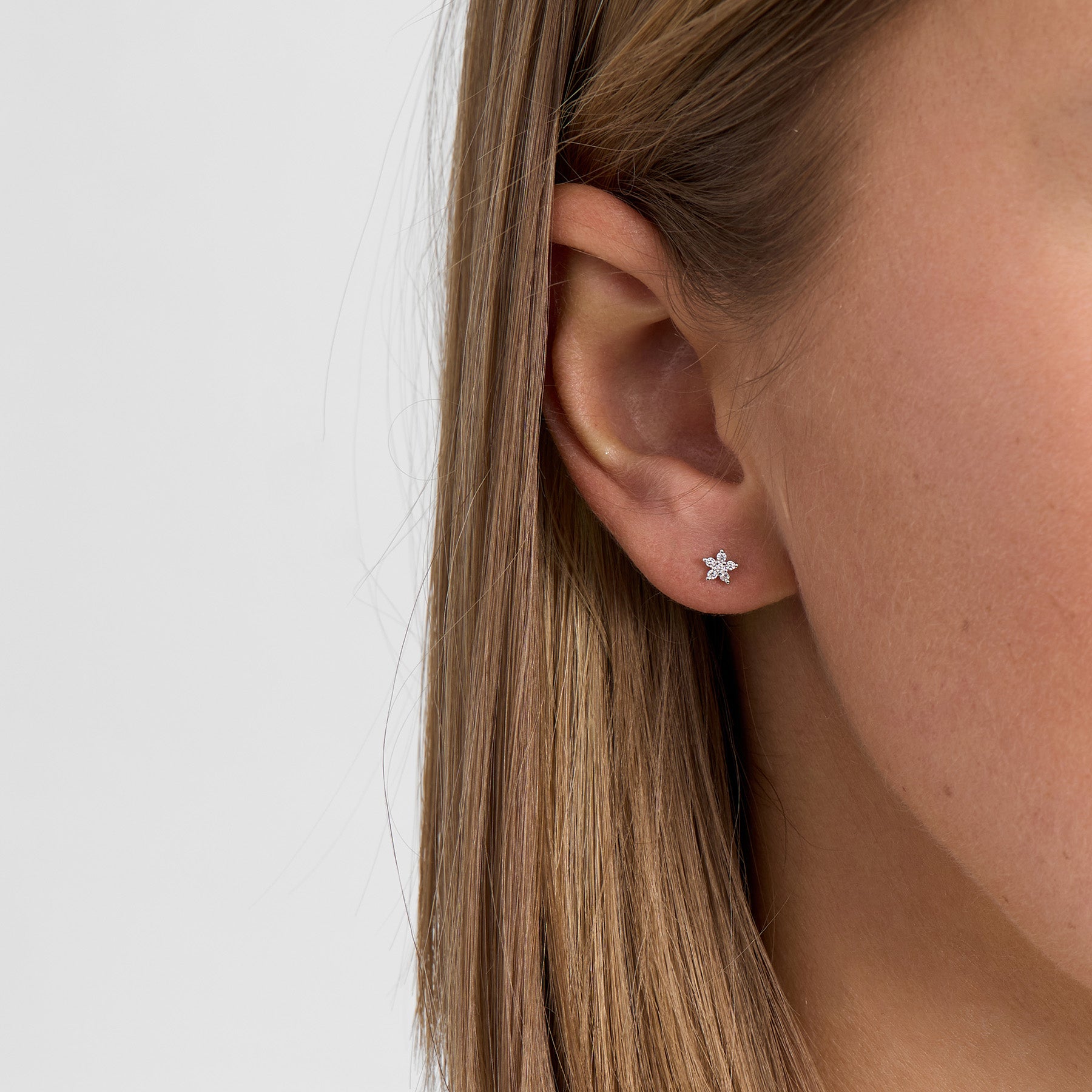 The design by Mads Ziegler in the Céleste series is inspired by the calm tranquility and harmonious shapes of the night sky. The zirconia stones gather in a circular rosette that directs the light towards the center and creates a subtle glow around the ear. The polished silver also emphasizes a modern, clean expression with clear references to Danish design and refined craftsmanship.