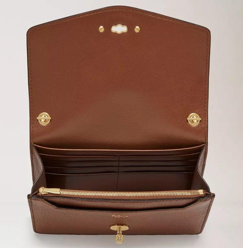 Small Darley in the color Oak from Mulberry, has the iconic postman's lock in gold hardware. The simple and classic look means that you can use it for both everyday life and parties. It has a place for eight credit cards and a practical zipped pocket.