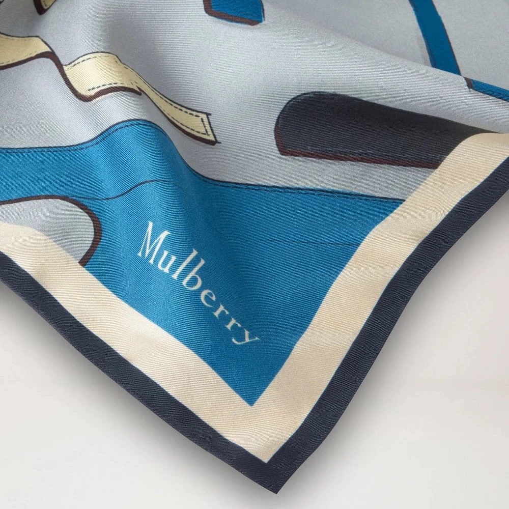 The square design offers many possibilities of use - wear it elegantly around the neck, in the hair, or as a sophisticated touch on your favorite bag from Mulberry. The light gray shade gives a timeless and refined expression, inspired by Mulberry's iconic Bayswater Workshop universe.