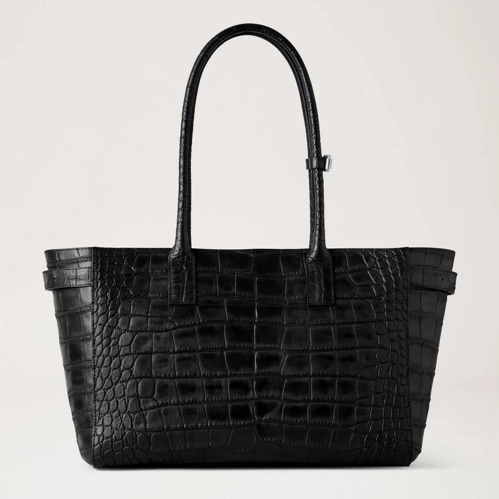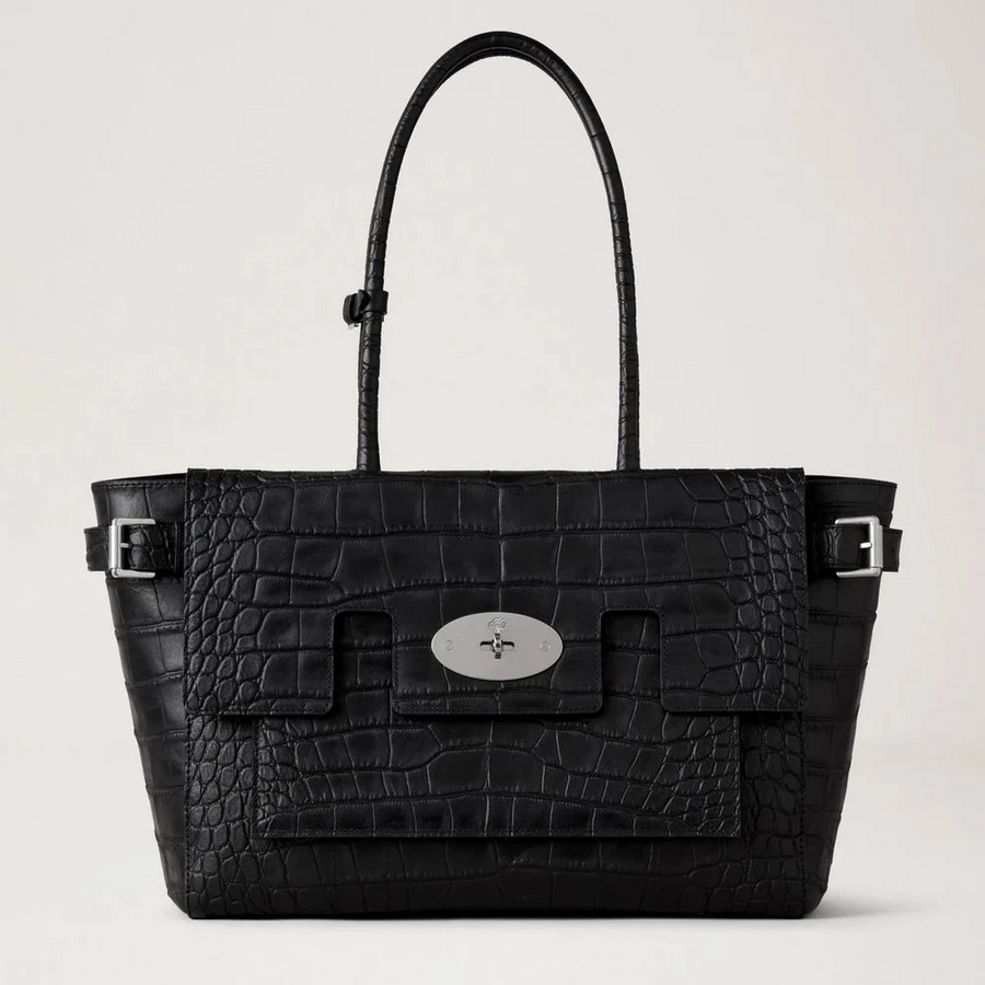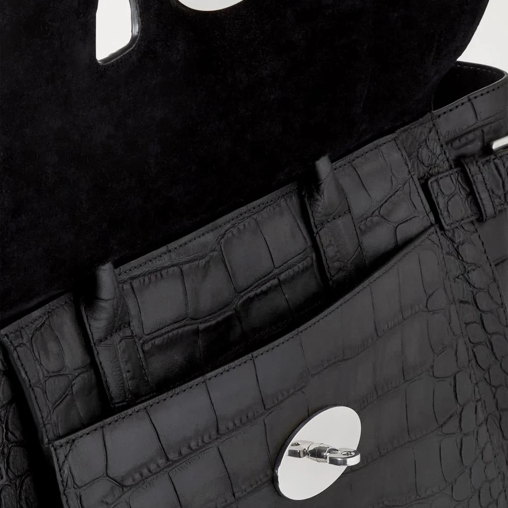 Tasken er udført i sort Croc NVT-læder, som kombinerer et eksklusivt croco-præg med en robust og luksuriøs finish. De sølvfarvede detaljer, spænder og Mulberrys ikoniske Postman’s Lock giver tasken et markant og moderne udtryk.