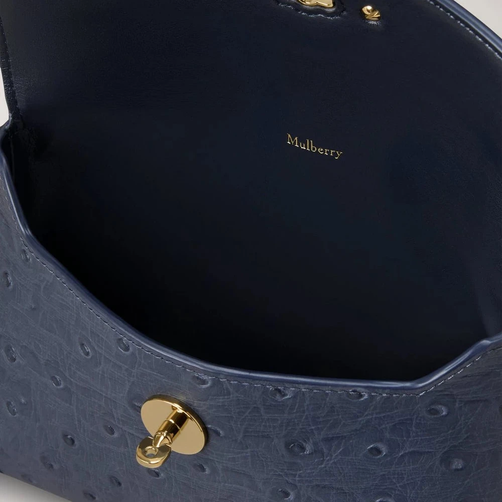 The pouch is designed in Italian calf leather with a glossy finish and hand-applied ostrich embossing, making each bag unique. The iconic one Postman's Lock on the front flap completes the look and adds a discreet Mulberry touch of luxury.