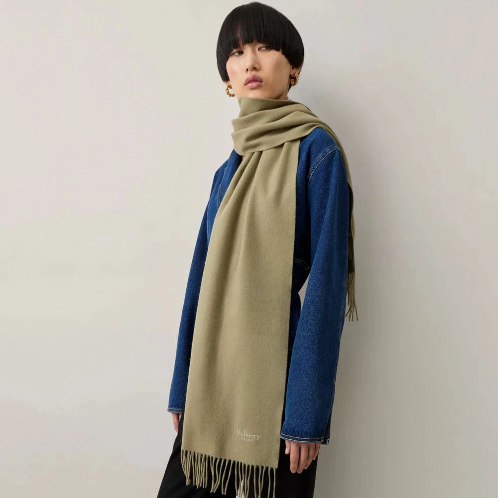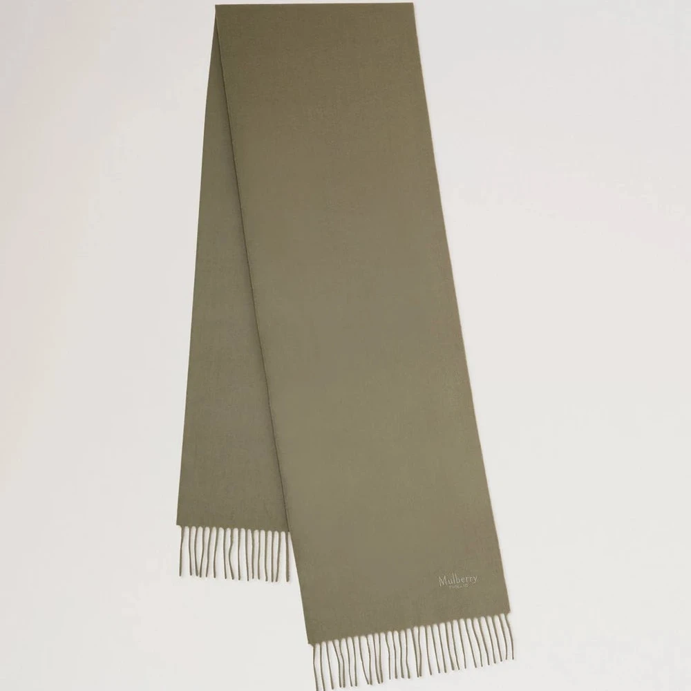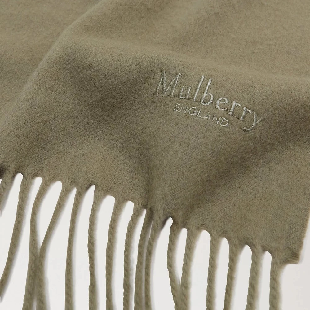 The simple, solid color design makes the scarf easy to match with any wardrobe, while the fine fringes and that embroidered Mulberry logo gives a discreet, exclusive look. Made in the UK with a focus on quality and classic craftsmanship.