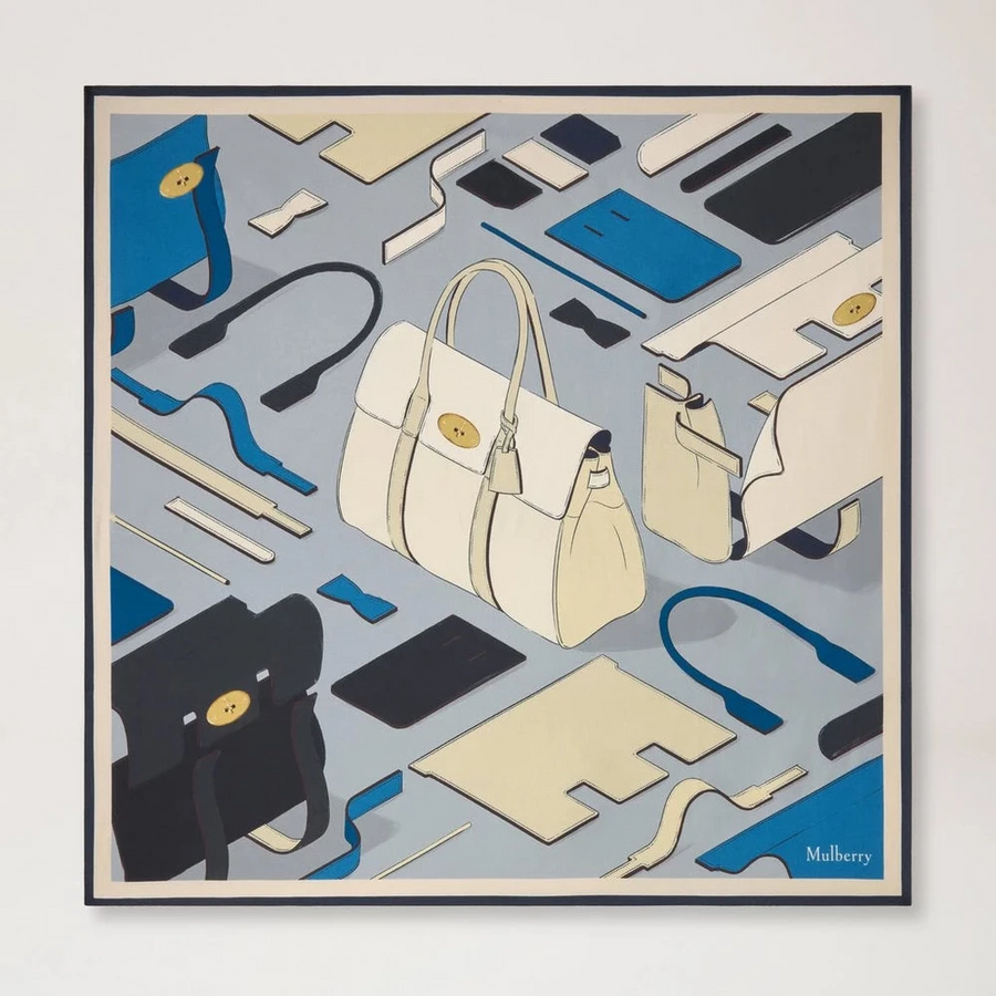 The square design offers many possibilities of use - wear it elegantly around the neck, in the hair, or as a sophisticated touch on your favorite bag from Mulberry. The light gray shade gives a timeless and refined expression, inspired by Mulberry's iconic Bayswater Workshop universe.
