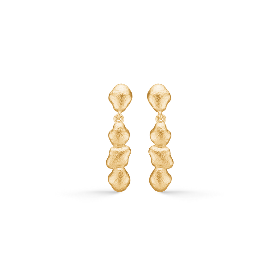 Lumi earrings in 925 sterling silver with 18 kt. gilding. Inspired by freshly fallen snow, the design brings together small organic shapes for an elegant and calm expression. The matte texture catches the light discreetly, while the lower link moves freely and brings life to the look. The earrings measure 22mm and can be worn alone or styled with others for a personal stack.