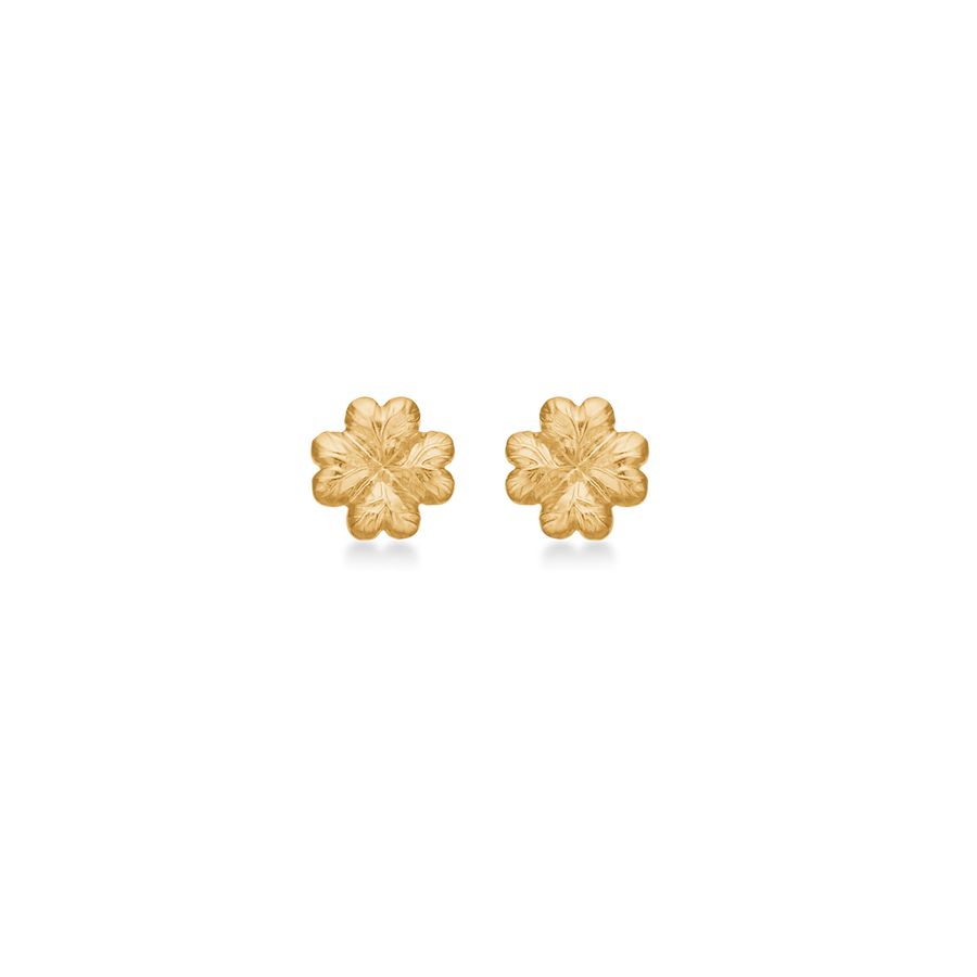 Serene Clover earrings in 925 sterling silver with 18 kt. gilding. Delicate clover earrings with heart-shaped leaves and a lightly textured surface that combine a feminine expression with a subtle, raw twist. The earrings measure 5 mm and are perfect for everyday wear or as a discreet detail in layer-on-layer styling.