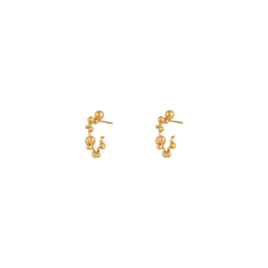 Orb Chronicles Hoops are inspired by the underwater bubbles that move gracefully through the water until they break the surface of the ocean. These earrings are set with bubbles in varying sizes, creating a simple and elegant hoop that is both modern and timeless. The 18k gold-plated surface gives a luxurious touch, and the delicate shape makes them perfect for both everyday life and special occasions.